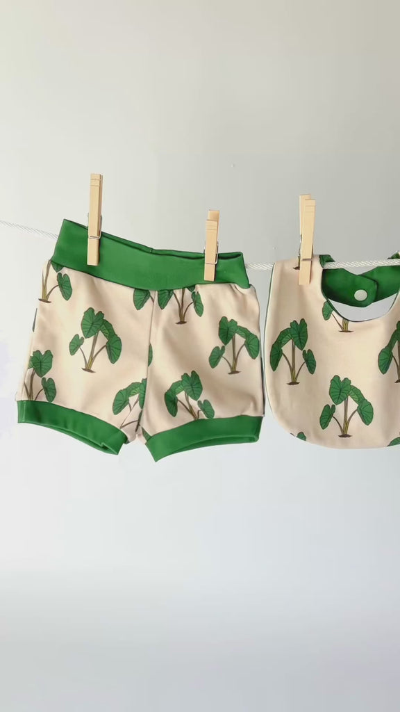 Soft and stretchy organic knit baby shorts and matching bib featuring our taro / kalo design with contrasting trim. These bummies are perfect for layering over diapers. Designed with comfort in mind, they pull on easily without tight elastic and are made with eco-friendly materials that are gentle on baby’s delicate skin. A must-have for your little Hawaii baby's wardrobe.